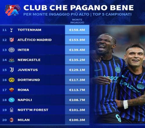 本赛季五大联赛球队年薪TOP20: