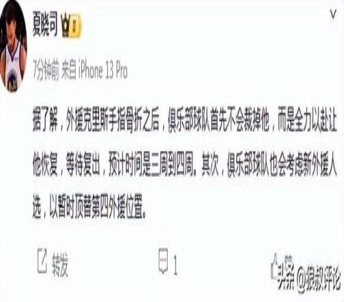 北京时间3月22日,根据媒体人“夏晓司”报道,外援克里斯手指骨折之后,俱乐部球队首先不会裁掉他,而是全力以赴让他恢复,等待复出,预计时间是三周到四周。其次,俱乐部球队也会考虑新外援人选,以暂时顶替第四外援位置。
