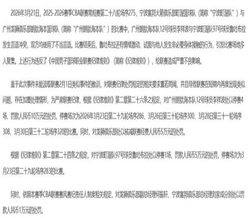 3月21日号下午,CBA联赛分别开出了6张罚单,以李祥波和鲁吐布拉在“比赛结束后发生言语冲突,双方均使用了不当言语,鲁吐布拉还有情绪激动、试图与他人发生非必要身体接触的行为,引发比赛场地多人聚集,给联赛造成严重不良影响”为由,对李祥波处以停赛4场,罚款10万的处罚,鲁吐布拉停赛1场,罚款5万