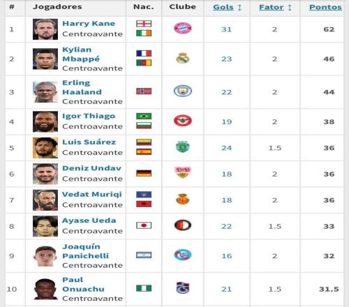 本赛季五大联赛球员联赛进球数排行:凯恩31球居首,姆巴佩23球